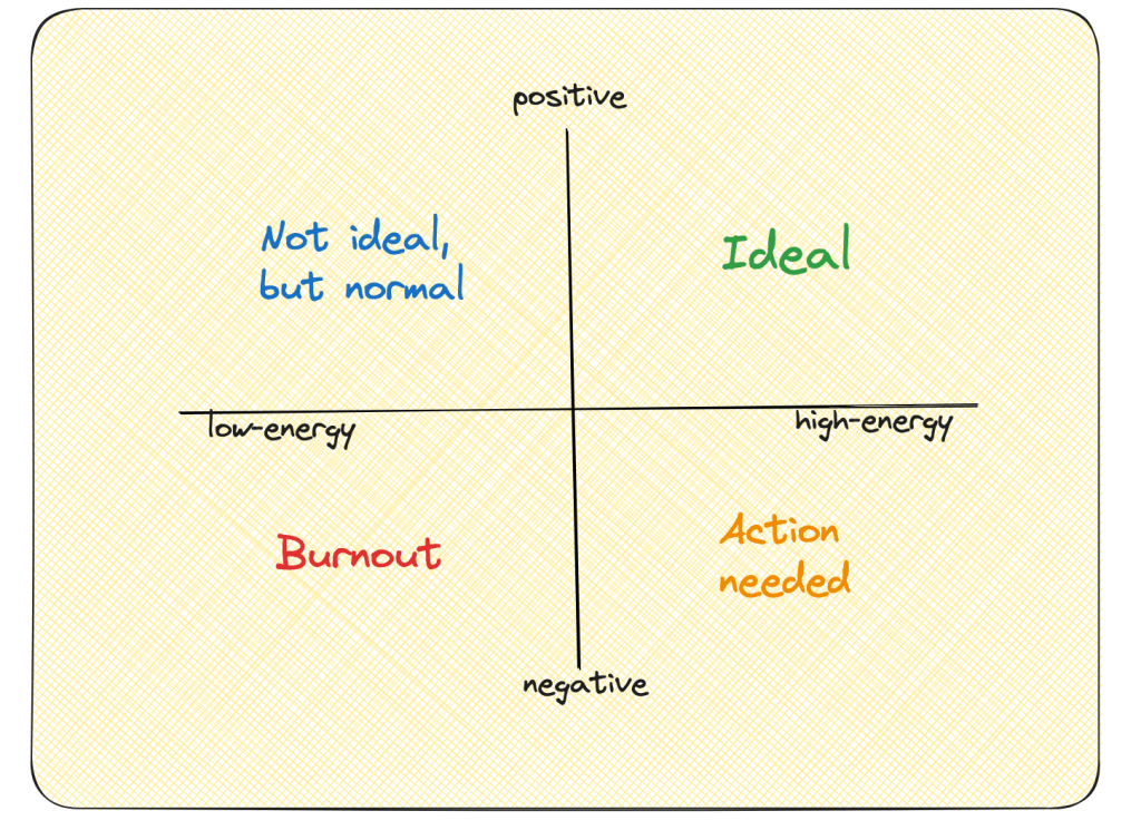 Another helpful tool to consider burnout is the relationship between energy levels and positivity (I’m not sure where this idea originated to link the reference, but if you do, please DM me). I’ve drawn the following image of four quadrants but avoided the usual labels (e.g. Toast) because I’m not a fan of them: